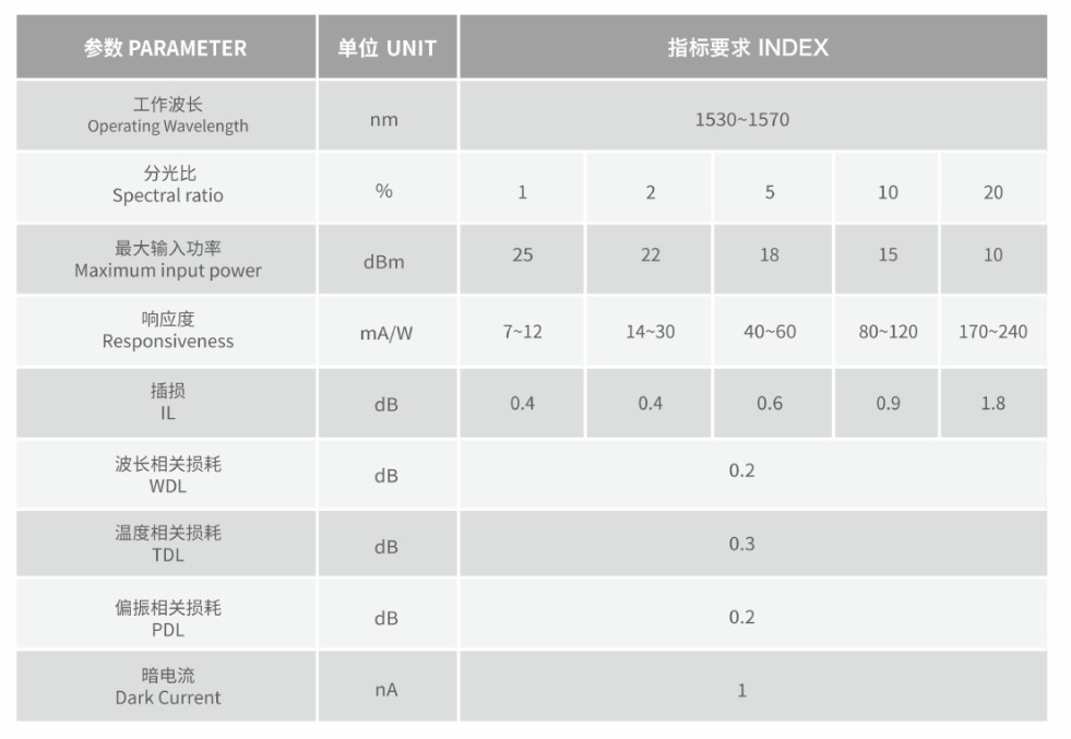雙芯尾纖式結(jié)構(gòu),實(shí)現(xiàn)一定比例的光透射到探測(cè)器,其余的光反射到另一根光纖。用于WDM網(wǎng)絡(luò)監(jiān)控、光纖放大器、光開關(guān)等。